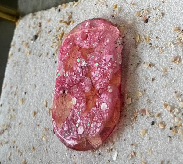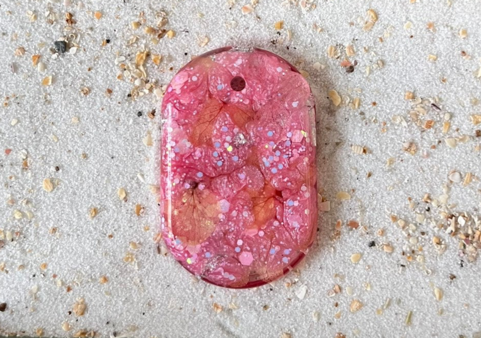 Ovale roze tag met droogbloemen en zilveren stukjes folie.