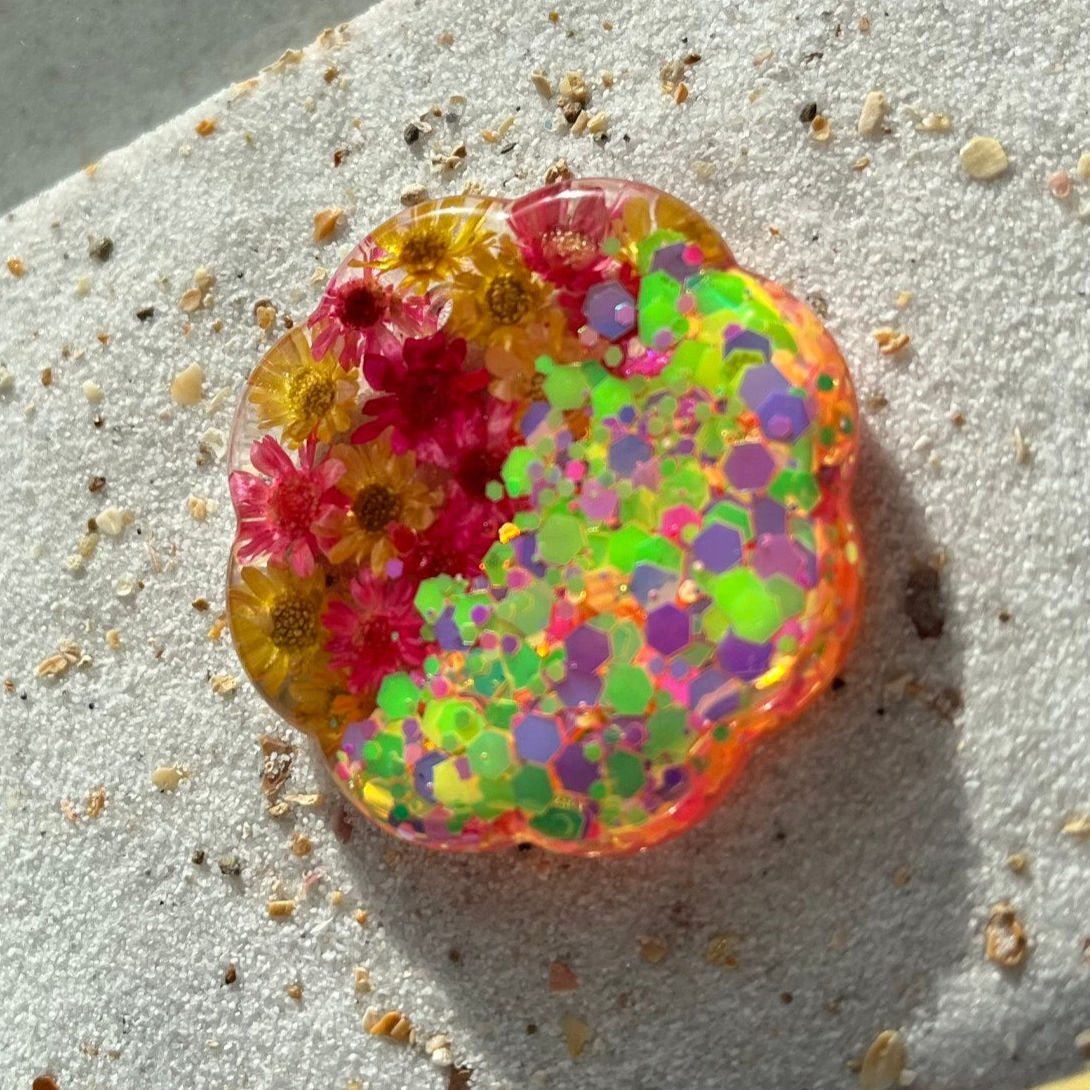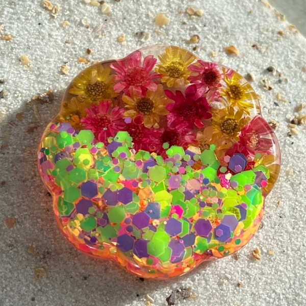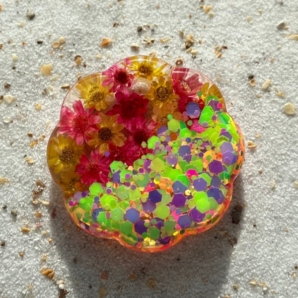 Tag in bloemetjesvorm met gele en roze glitters en droogbloemetjes.