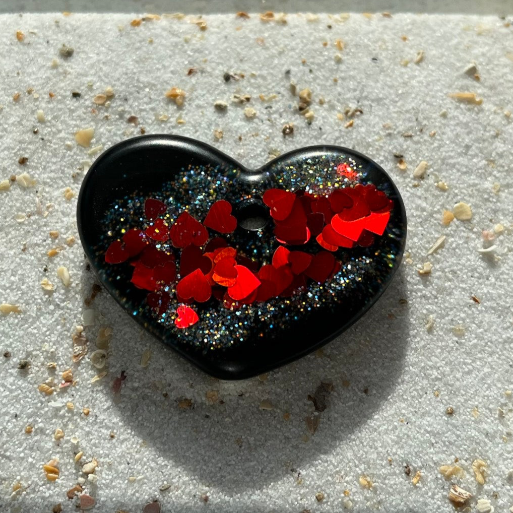 Zwart "schuin" hartje met fijne gouden glitter en rode hartjes.