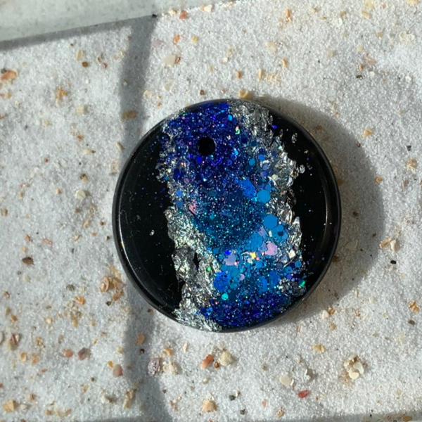 Zwarte ronde tag met in het midden een overloop van blauwe glitters en zilveren folie.