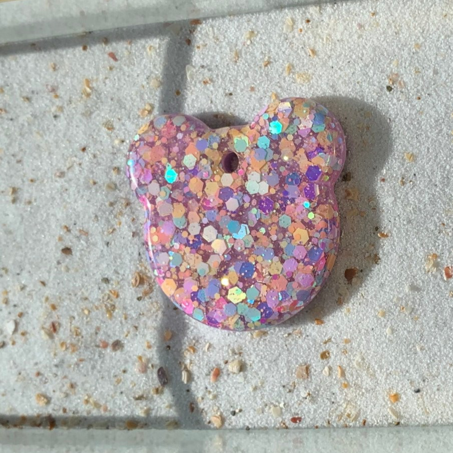 Beervormige tag in een multikleurige glitter en afgewerkt met lila pigment.