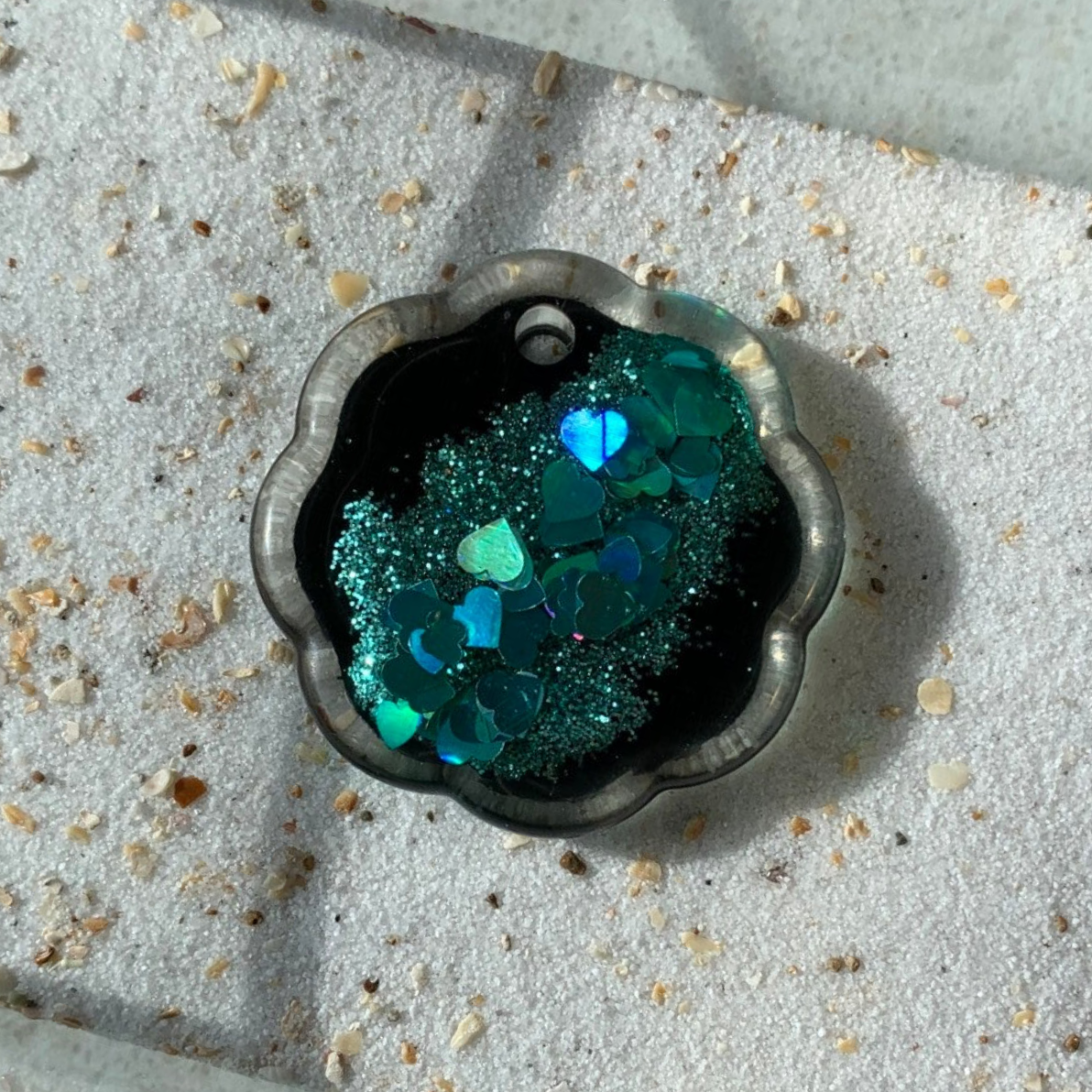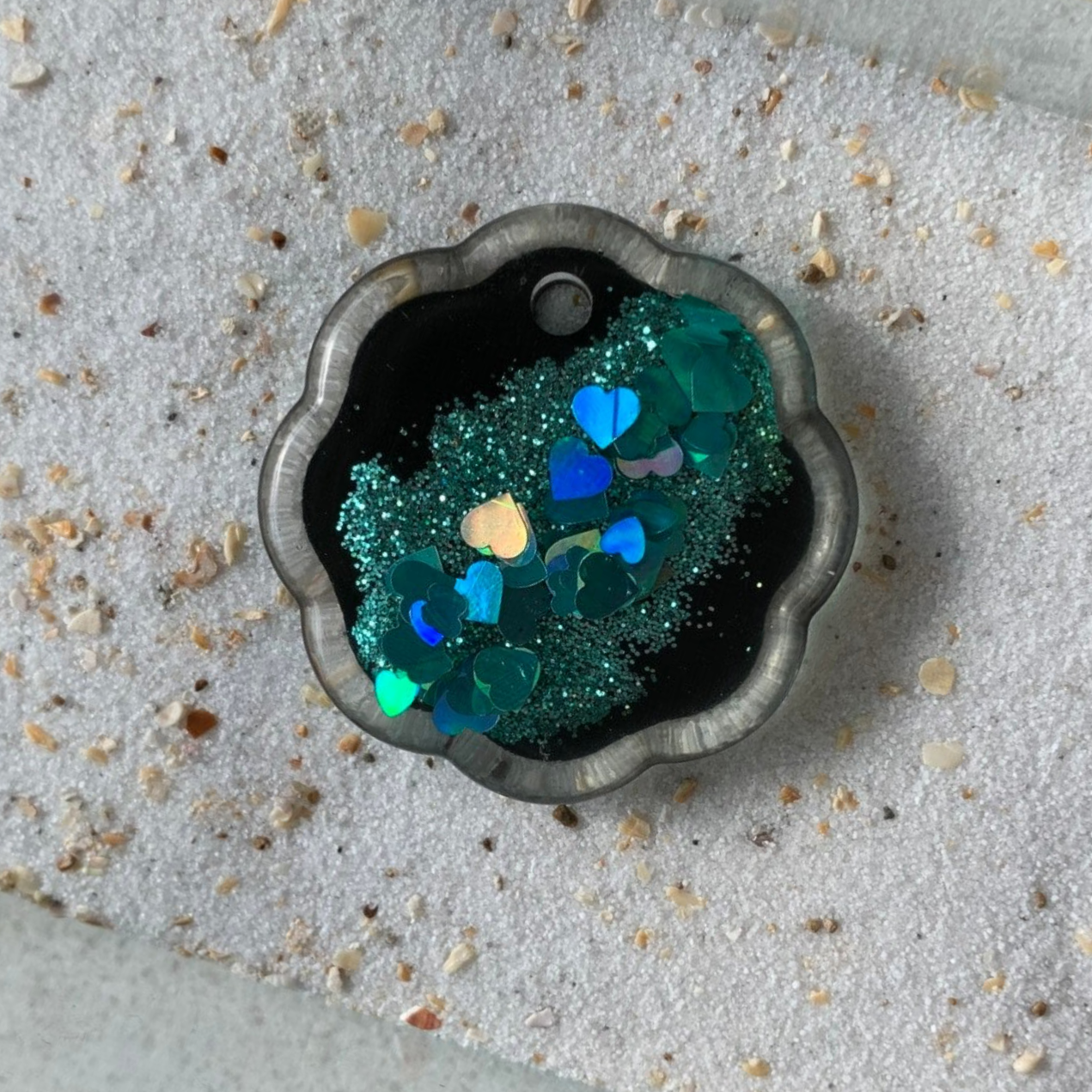 Zwarte bloemvormige tag met petrol fijne glitter en hartjes.
