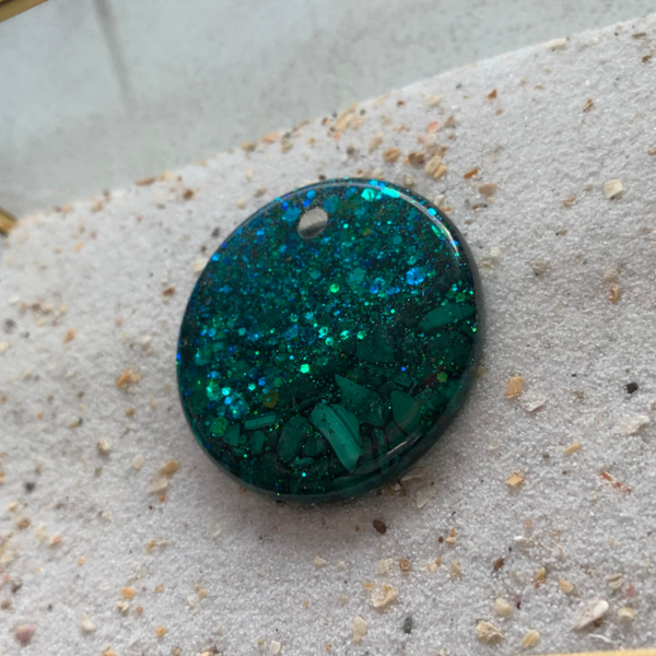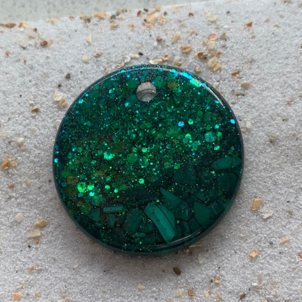 Ronde tag met malachiet (💎) en een groene glitter.